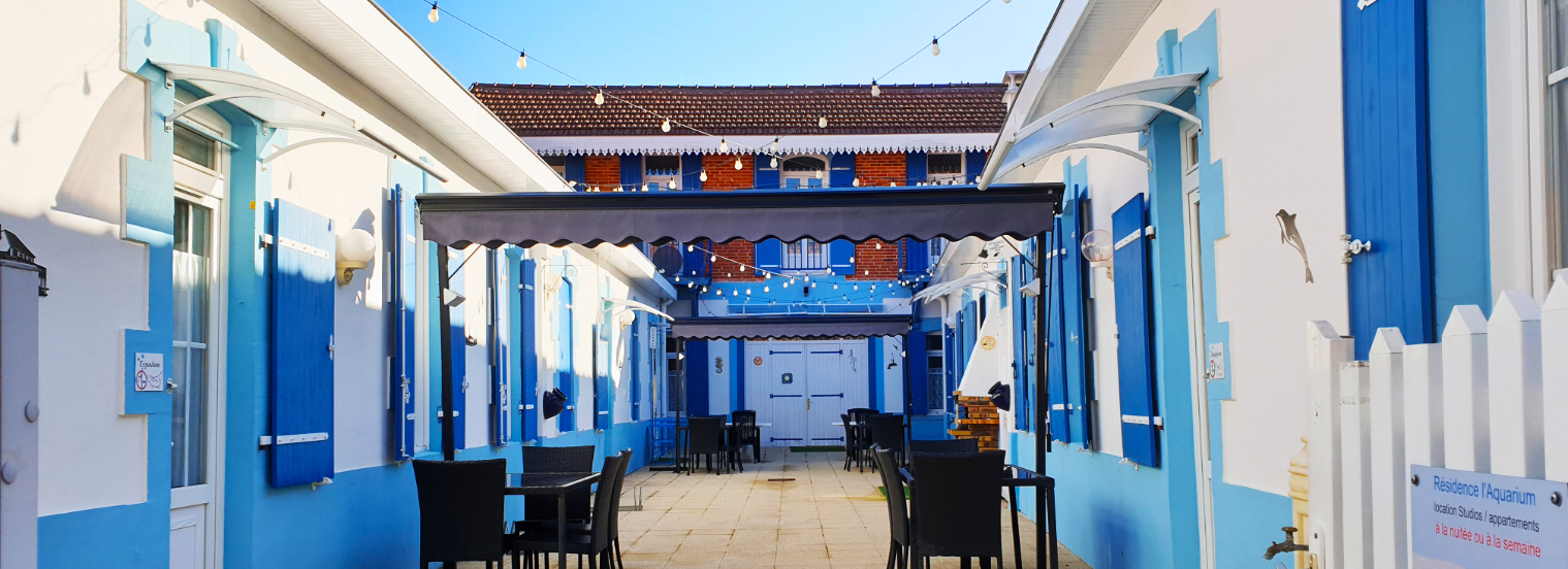 Au coeur d'Arcachon. L'Aquarium est un ensemble de 4 studios et 4 appartements meublés parfaitement agencés. Murs chaulés et volets bleus, patio fermé par la bâtisse en briquette rouge avec barbecue à disposition, l'ensemble est vraiment très agréable.